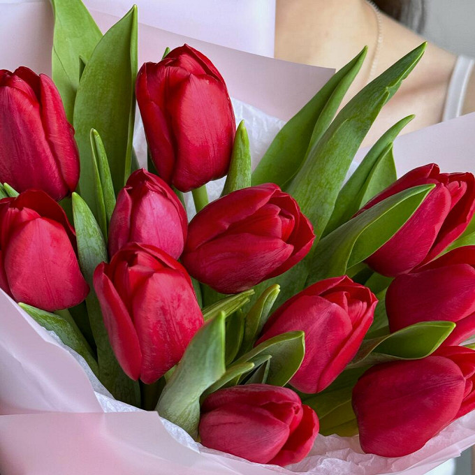 красный тюльпан 11 шт, фирменная упаковка., Размеры: высота 40 см, ширина 25 см.